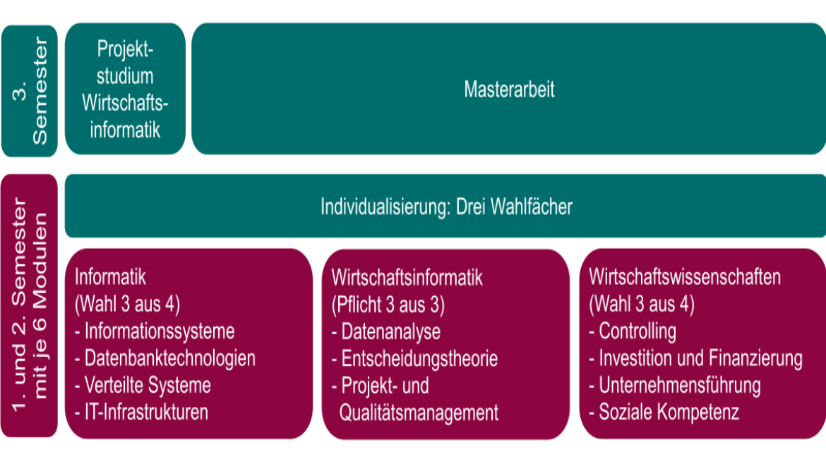- Profilbildung innerhalb der Gruppen Informatik, Wirtschaftswissenschaften, wobei drei Module aus vier Modulen zu wählen sind. Die drei Module der Gruppe Wirtschaftsinformatik sind Pflicht.